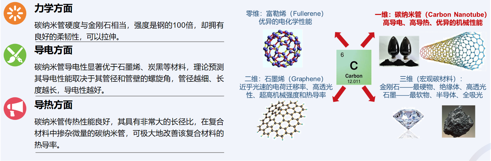 碳纳米材料是一种分散相尺度至少有一维小于100nm的碳材料。碳纳米管(CNT)是由单层或多层的石墨烯层围绕中心轴按一定的螺旋角卷曲而成一维量子材料,按石墨烯片的层数可分为单壁碳纳米管和多壁碳纳米管,具有力学、电学、导热、化学稳定性等多方面的突出性能。